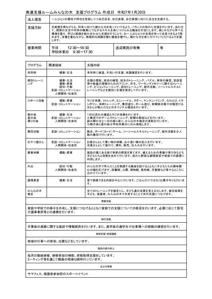 支援内容の公表 放課後等デイサービスみんなのね放課後等デイサービスみんなのね支援プログラム作成日:令和7年1月13日法人(事業所)理念一人ひとりの個性や特性を受容しつつ、自己決定・自己表現・自己実現に向け…