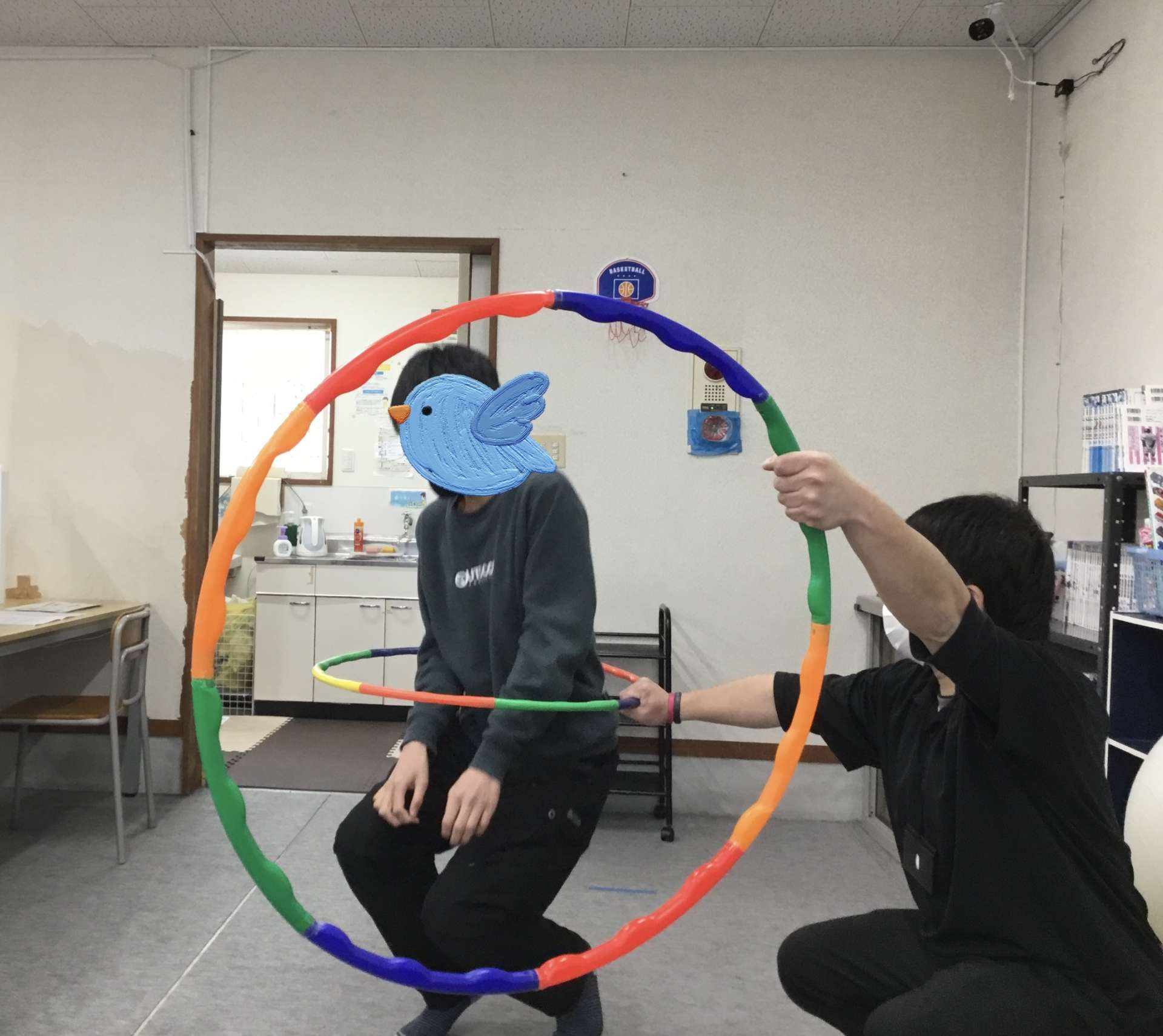 ボール、フラフープを使ったトレーニング 学習後は、室内でトレーニング!利き手ではない手も使ってボールをドリブルしたり、フラフープにぶつからないように中を通ったり、、いつも使っている道具も、いろんな使い方ができますね!